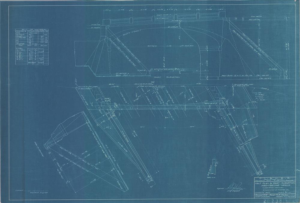 Arch bridge no.16.29--Plan and east elevation--1/4 mile east of Foster, PA [1915.05.11] Sheet 1 of 3