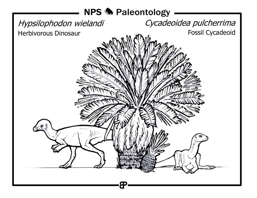 "Cycadeoidea pulcherrima" is an example of an extinct group of seed plants known as cycadeoids. These plants lived during the Cretaceous. A small dinosaur known as "Hypsilophodon wielandi" is shown with the