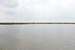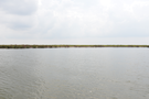A wide view of the Louisiana coastline, with a cloudy sky, marshland on the horizon, and grey waters.