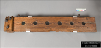 2 boards, each with 6 half circular holes cut in 1 side which when put together form 6 circular openings for legs of 3 prisoners. Boards hinged on 1 end using 3 sets nuts, bolts, washers fastened through 2 pieces wood, 1 on each side of boards. Top board swivels on these fasteners. 2 additional sets located on bottom side of bottom board. On end opposite hinge is ring on bottom board through which chain was threaded. Ring on top board & chain missing. Stocks sit on 2 rectangular blocks wood with notches cut in top. Believed used to punish Kingsley Plantation slaves, though this not verified.