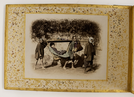 Sepia photograph with shades of blue, green and red representing a Japanese woman being carried in a palanquin by three Japanese men. The photograph is placed in the center of an album page decorated with a gold-leaf frame, colorful dots, and an inscription.