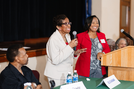 An older african american woman in a white suit speaks into a microphone while standing behind a green table. An african american woman wearing a bright red blazer smiles brightly as she leans against a wooden lectern listening to the first woman