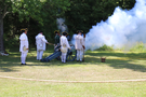 A Grasshopper cannon being fired at Cowpens. The men firing the piece are wearing period clothing and are holding various instruments to use the piece.