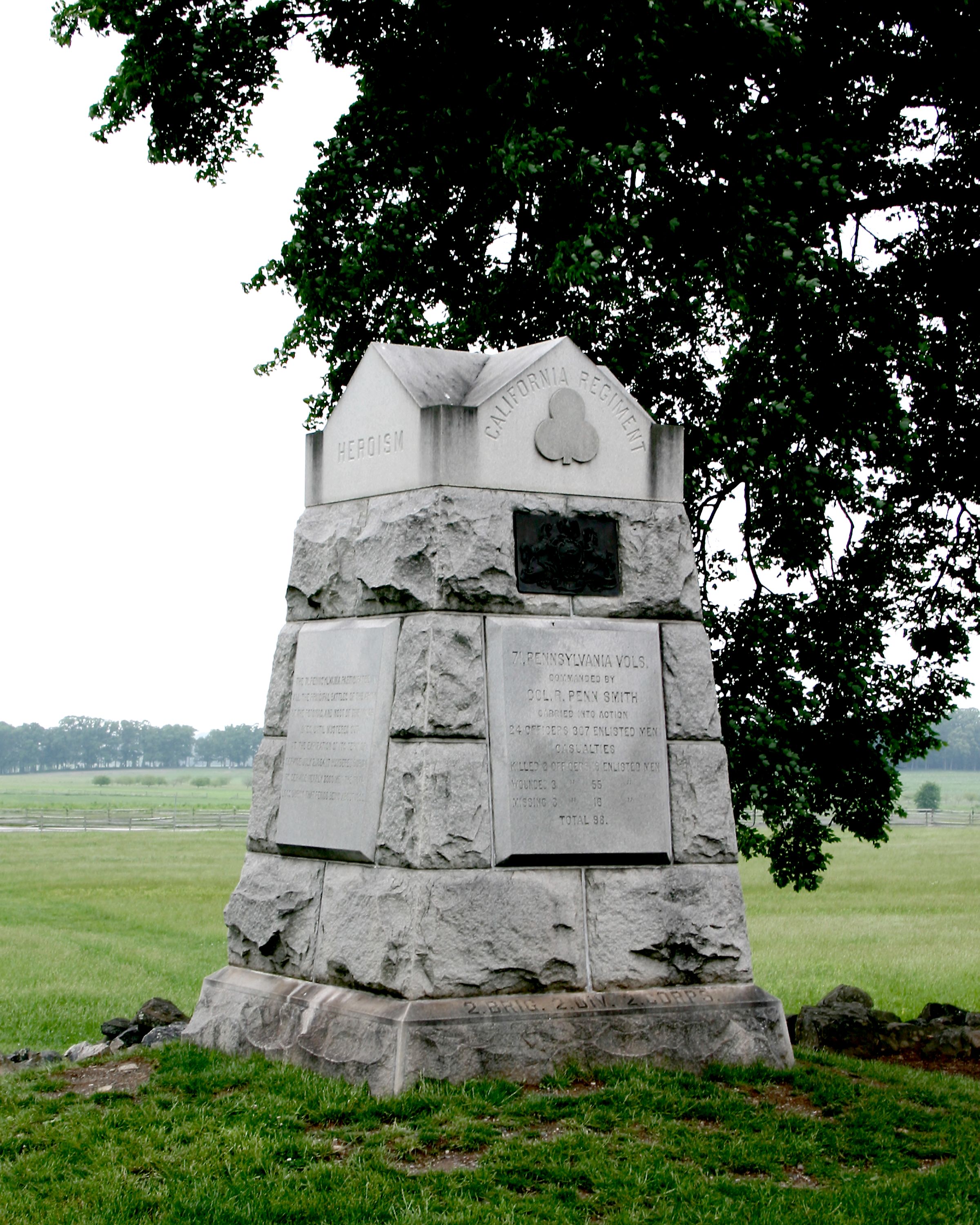 1 of 110 MN to PA. Dedicated 07/03/1886. Indicates position 71st PA Infty held 07/03/1863 at the Angle. Wall breached, LF & center retired to RF position. Located at Angle off Webb Rd. LF 114' S of MN. || Mn & 2 Flank Markers. Mn: fdn 6'1" sq, battered shaft, rough-cut/laid blocks, w/ polished tablets, bronze medallion. Cap cross gable, trefoil. Incised/excised inscrip/detailing. All 10'1"H. Markers: 1'sq x1'6"H. Cleaned, 1985-1987, tablet stained.