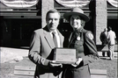 BW Photos of the Zion Lodge Rededication Ceremony. Superintendent Harold (Harry) Grafe speaking with man and woman. ; ZION Museum and Archives Image 800_20_01007 ; ZION 15933