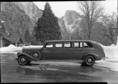 Copy Neg: Leroy Radanovich, December 2001. Auto stage arriving at the Ahwahnee Hotel.