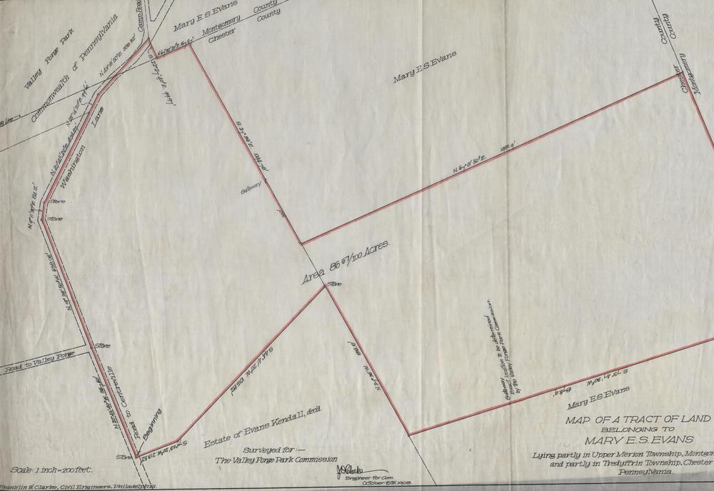 Document: Description of a Tract of Land A Portion of the "Continental Camp Farm" of Mary E.S. Evans, Lying partly in Upper Merion Township, Montgomery County, and partly in Tredyffrin Townsip, Chester County, Pennsylvania