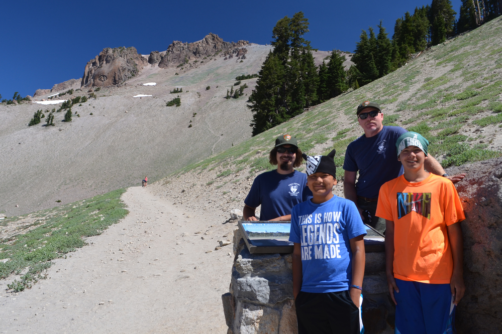Trail crew members and young family members standing at Lassen Peak trailhead