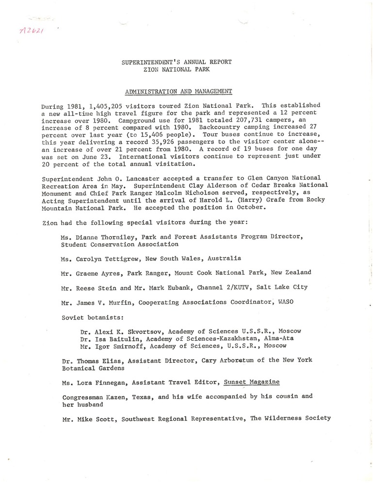 Superintendent's Annual Report 1981. ZION_15646_001.087. The various topics covered pertain to construction, budget/finance, wildlife, management, personnel, concessions, publications, visitor statistics and search and rescue operations.