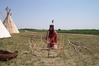 A man in native dress tying sticks into the shape of a boat in a grassy field with canvas tipis beside hime