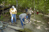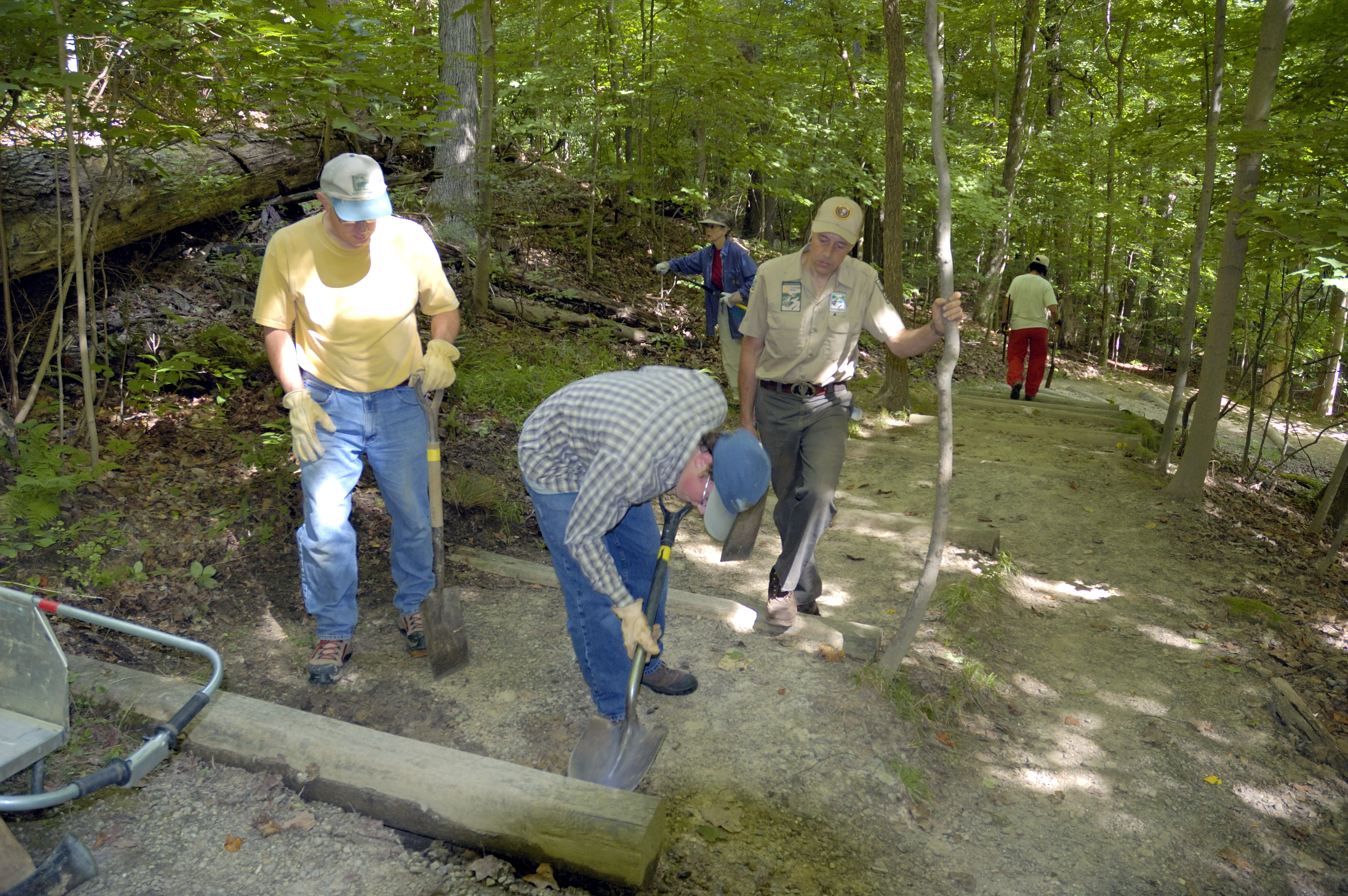 Here volunteers are improving the Stanford Trail by replacing a footbridge and repairing stairs. Images taken in summer at Stanford Trail in Boston, Ohio. || Cuyahoga Valley Trails Council (CVTC) is an all-volunteer, non-profit organization dedicated to improving the trails in Cuyahoga Valley National Park. These park volunteers meet for monthly work sessions from March through December as well as special events.