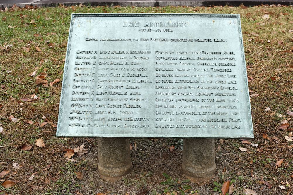 Marker contributes to national significance of park under NR Criterion A because it represents the national movement among veterans & related groups to commemorate Civil War battlefields. || 4' x 3' bronze inscription tablet with decorative border mounted on two low marble pedestals. Describes activities of Ohio artillery units from November 23-25, 1863.