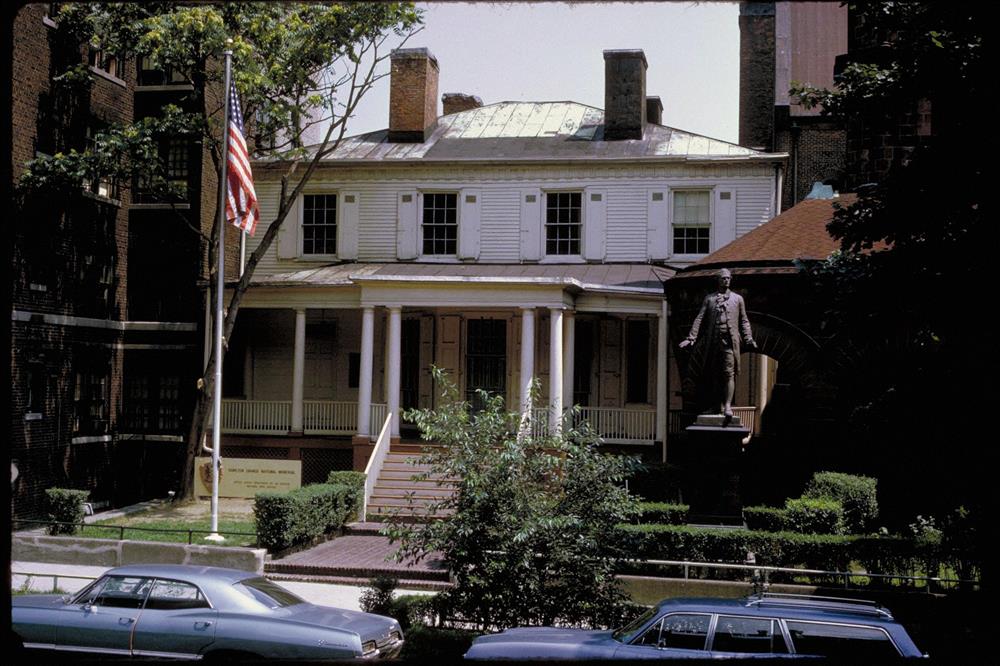 Hamilton Grange National Memorial, located at 287 Convent Avenue, preserves the home of founding father Alexander Hamilton. Born and raised in the West Indies, Hamilton came to New York in 1772 at age 17 to study finance at King's College (now Columbia University). Hamilton became a supporter of the cause of the American patriots during the political turmoil of the 1770s. Commissioned as a Captain of Artillery at the beginning of the American Revolution, he soon became an aide-de-camp to George Washington. After the war, as a member of Congress, Hamilton was instrumental in creating the new Constitution. As co-author of the Federalist Papers he was indispensable in the effort to get the Constitution adopted. As the first Secretary of the Treasury (1789-1795) he devised plans for funding the national debt, securing federal credit, encouraging expansion of manufacturing and organizing the federal bank. Hamilton commissioned architect John McComb Jr. to design a Federal style country home on a sprawling 32 acre estate in upper Manhattan. This house was completed in 1802 and named "The Grange" after the Hamilton family's ancestral home in Scotland, but served as his home for only two years. On July 11, 1804, Hamilton was fatally wounded in a duel with his political rival Aaron Burr.