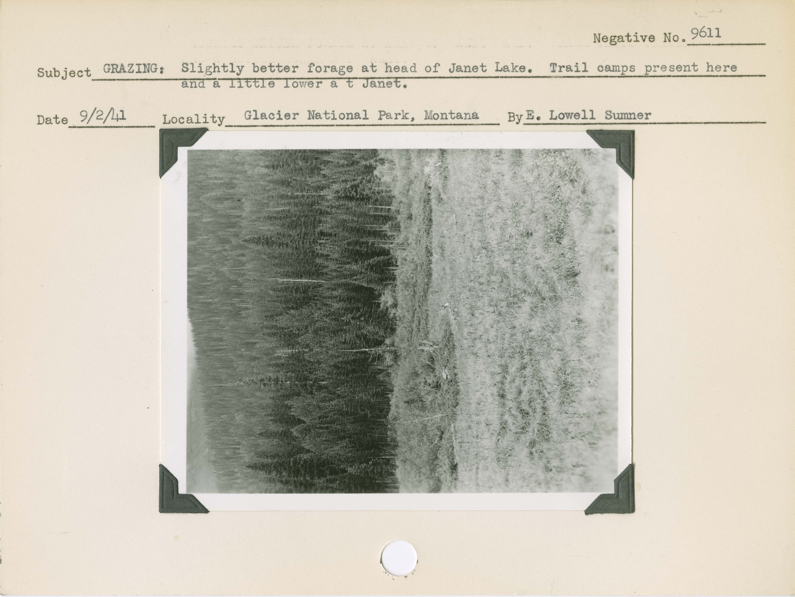 Grazing: Slightly better forage at head of Janet Lake. Trail camps present here and a little lower at Janet. Locality: Glacier National Park, Montana. Negative #: 9611