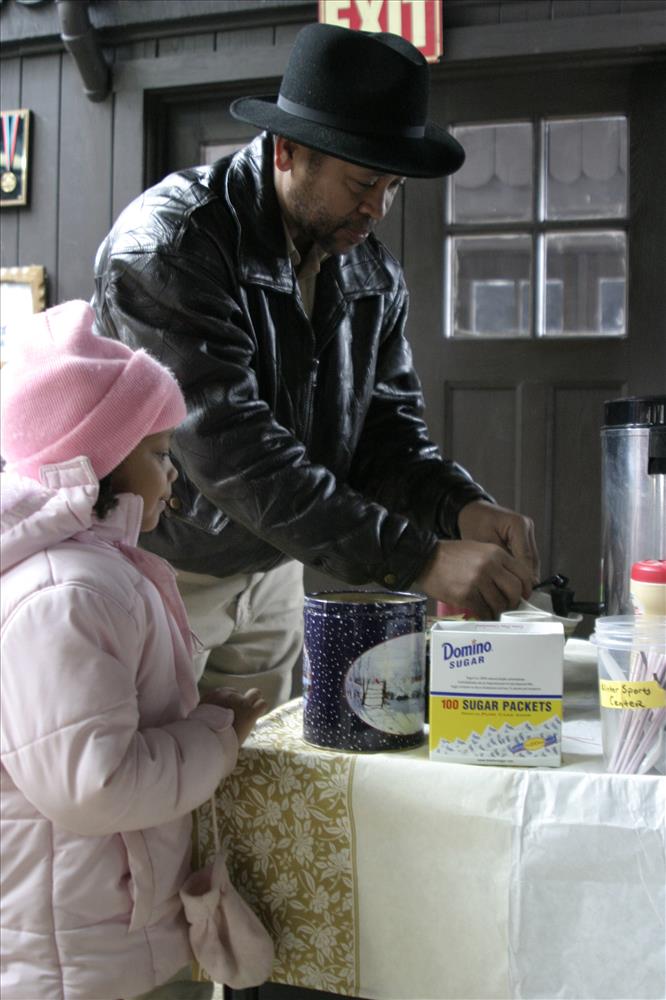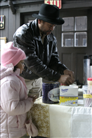 Children make crafts with Park Ranger Paul Motts inside the Winter Sports Shelter. Families enjoy hot drinks. SCA intern provides information to visitors. || During the winter months, the Kendall Lake Shelter becomes CVNP's Winter Sports Center. Services include cross-country ski and snowshoe rentals and winter recreation programs.