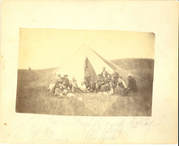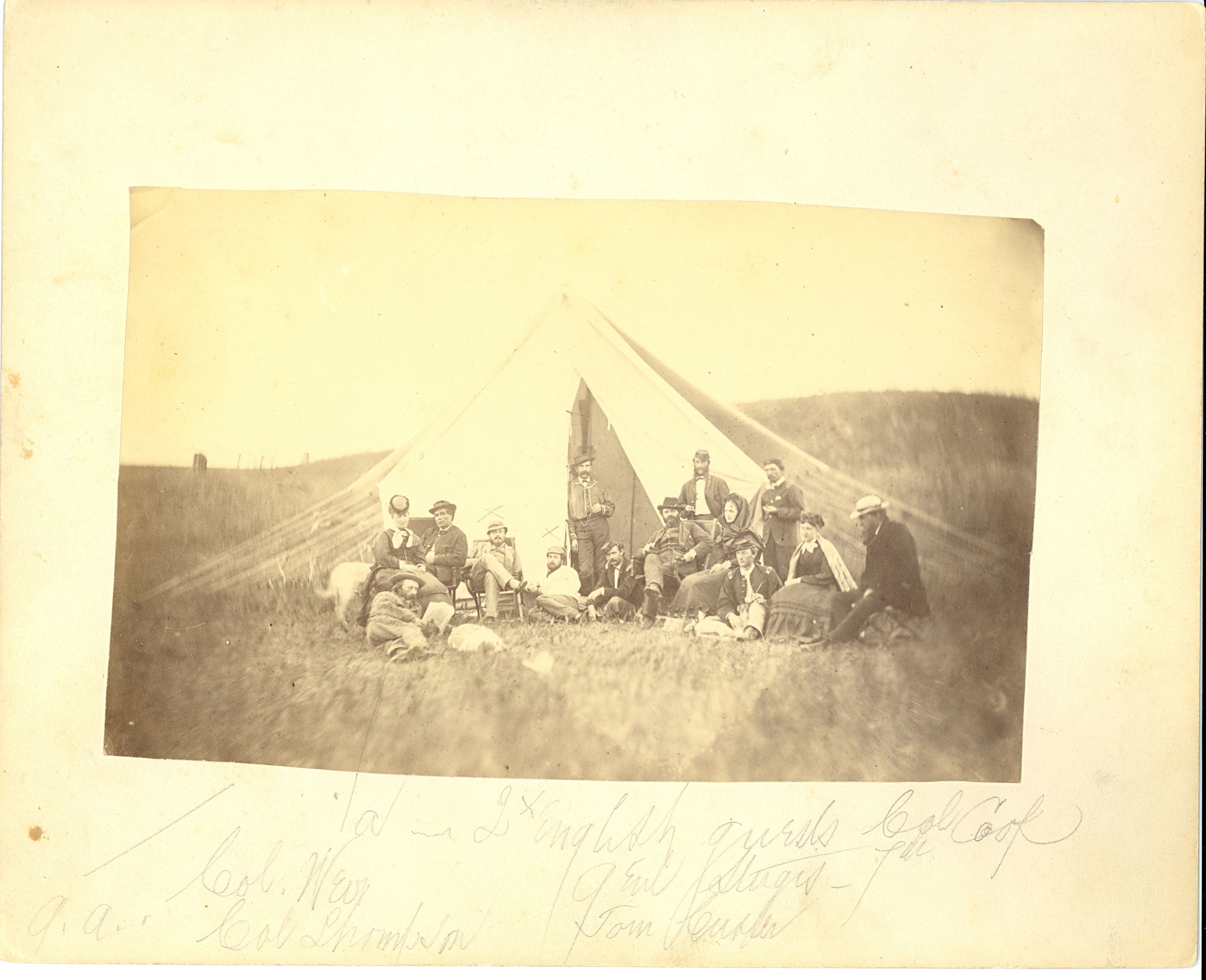 LIBI_00019_00498; This item is an original albumen, card-mounted photograph of a group of 14 people and several dogs in front of a tent on a buffalo hunt while camped near Fort Hayes, Kansas. The photograph is 4 3/4 x 7 1/2" (8" x 9 7/8" mounted"). As noted on page 85 of D. Mark Katz's book, the image was produced in 1869 and is attributable to W.J. Phillips of Preston, Missouri. Katz identifies the subjects, from left to right, as: Lieutenant Colonel George A. Custer, Miss Talmadge, Captain William Thompson, Lord Waterpark, Lord Paget, Lieutenant Myles Moylan, Captain Thomas Weir, Colonel Samuel D. Sturgis, Lieutenant William W. Cooke, Mrs. Elizabeth B. Custer, Lieutenant Thomas W. Custer, Captain Brewster, Mrs. Godfrey and Mr. Talmadge. On the front, a handwritten notation in pencil reads, "A. and 2 English guests/Col. Weir/G.A./Col. Thompson/Col. Cook/Gen'l Sturgis/Tom Custer." On the verso, a handwritten notation in pencil reads: "Kansas/Buffalo hunt given to/Lord Waterpark/Lord Paget/Officers of the