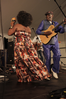 Mtukudzi, wearing a purple suit and flat cap, plays his guitar next to a woman performer shaking a rattle. She has her back turned and is wearing a dress with an abstract pattern of overlaying lines of black, white, orange, and brown.