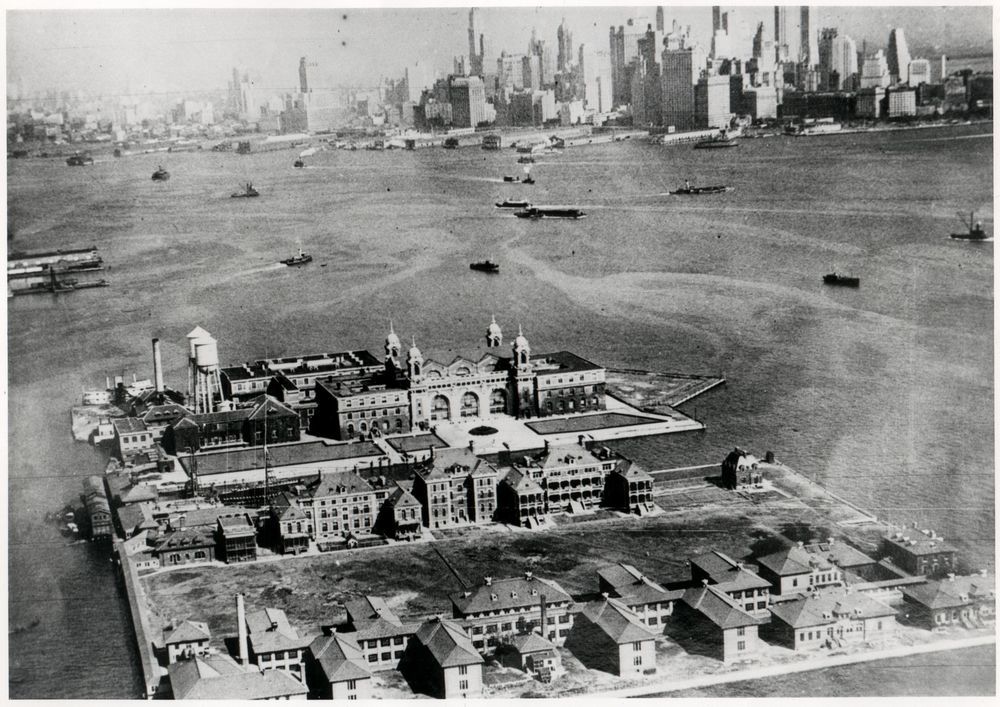 New York harbor, Bedloe's Island and the Statue of Liberty, and Ellis Island, ca. 1930