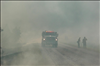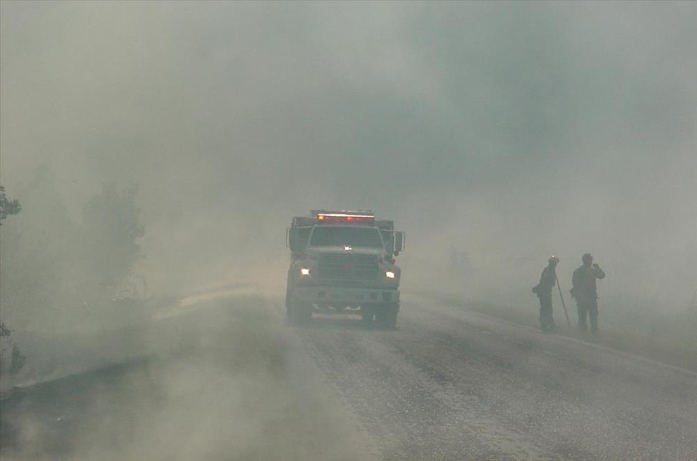 Fire engine and firefighters in the heavy smoke