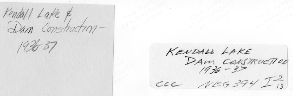 Construction of Kendall Lake & Dam, Civilian Conservation Corps ca. 1933. See scan of writing on the back of each image for additional details. || Many of the historic structures in the Virginia Kendall unit of Cuyahoga Valley National Park were built by Civilian Conservation Corps workers during the 1930s.