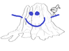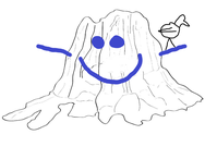 Line drawing of Big Stump with smiley face and bird.