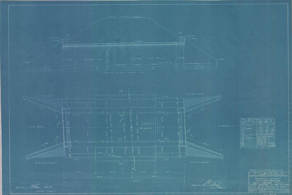 30-foot semicircular arch bridge no. 2.47 over highway--General layout--Dalton, PA [1913.05.23] Martins Creek Cut-Off Line--Concrete Department--Sheet no. 1 of 3--Revised June 12, 1913