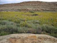 A large field of yellow sunflowers in front of a tall cliff at CHCU in September of 2006.