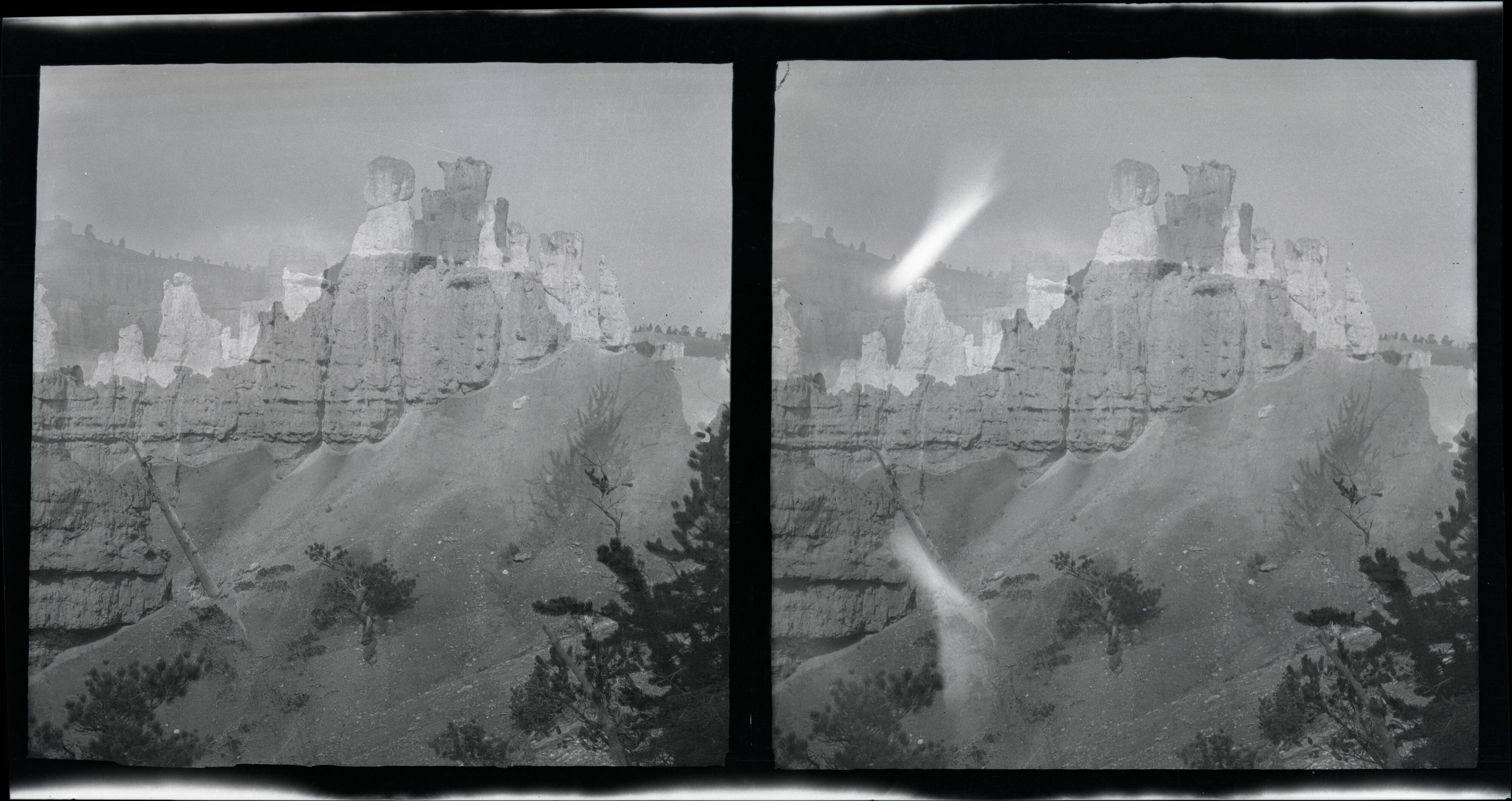 Stereoscopic negative of hoodoos from below the rim in BRCA. Sparse vegetation in foreground. ; BRCA Museum and Archives Image BRCA8875_002_020 ; BRCA 8875