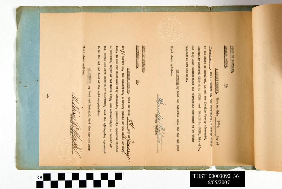 Sales contract between the Baltimore Museum of Art and Michael and Bessie Stone, type written, two grommets at top, multiple pages in blue cover, page 1