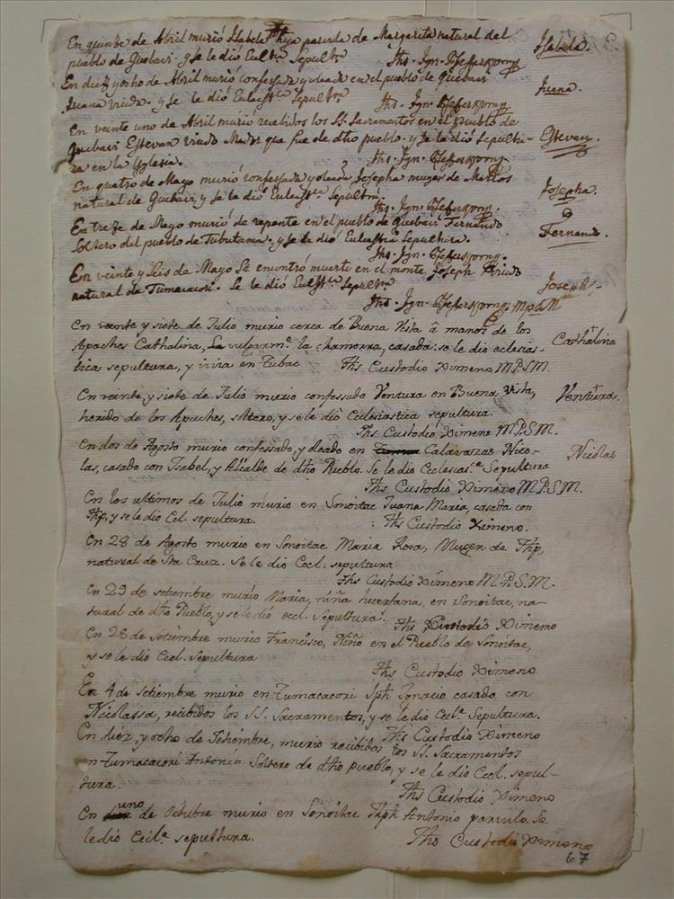 Guevavi Mission Record, page 67