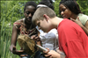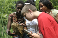 Students are participating in a unit called Roles and Residences. They are exploring the roles of different species and the diversity of habitats in a watershed. Here they are studying a pond ecosystem, catching small animals in nets and observing them in containers. Students record data in their Discovery Books. || The Cuyahoga Valley Environmental Education Center's residential program provides fourth through eighth grade classes an overnight educational experience that integrates science, nature study, environmental issues, and the arts. Students learn natural history and the concepts of watershed, biodiversity, and habitat. In addition, environmental issues and the process of environmental decision-making are explored. The curriculum is designed to meet state standards and teach proficiency skills, especially in science and social studies.