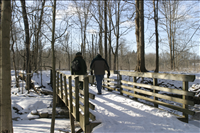 Visitors and park rangers hike on the Stanford Trail in winter.