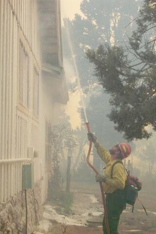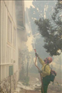 Fire fighters use hoses to battle structural fires during the Long Mesa fire at Mesa Verde National Park, summer 2002.