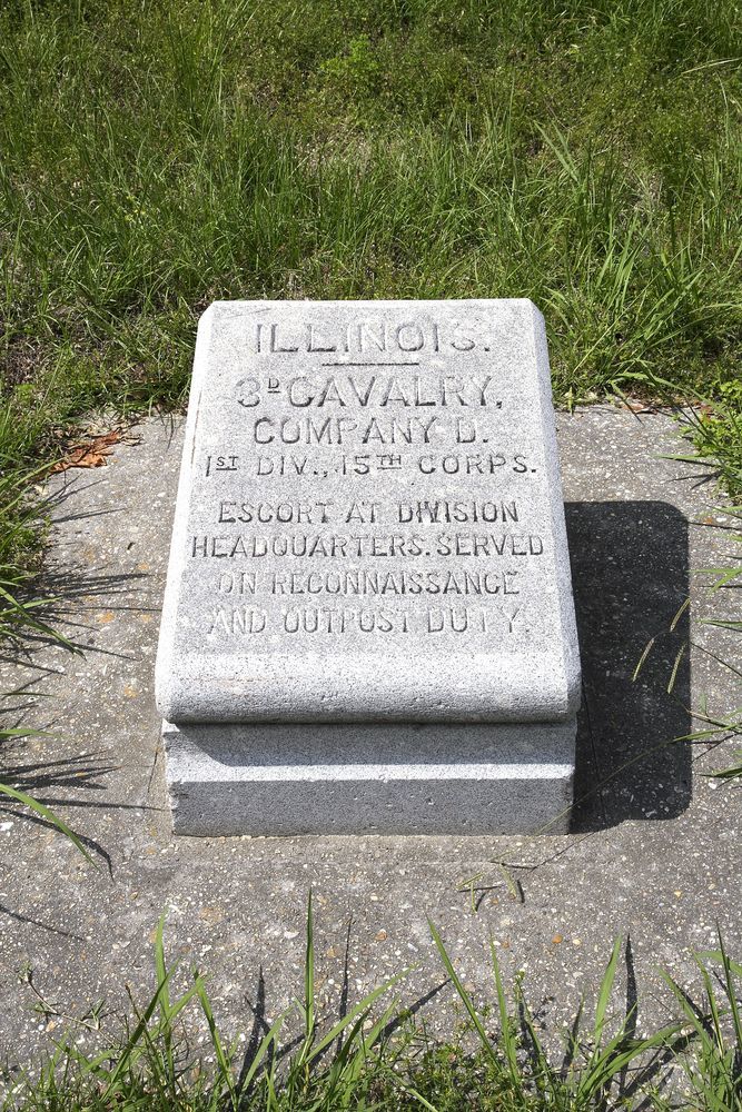 22" x 29" x 16" gray granite marker consisting of a nearly horizontal, scroll-form tablet with beveled sides and inscribed with "ILLINOIS" and unit designation.