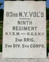 Erected by surviving comrades of the 83rd New York Volunteers to the memory of those fallen and to their Colonel, Joseph Moesch, on whose grave this monument rests. Moesch died in battle during the Wilderness campaign. || 6'H Mn in National Cemetery w/ 48"Lx48"Wx9"H rough-cut, tooled edge base, monlithic shaft tapering to pyramidal top w/ rough-cut banding. Polished faces w/ raised lettering. Circular bronze plaque at W w/ Regiment & Corps insignia.