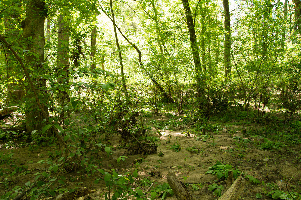 Floodplain communities are "scoured" by flood waters frequently. Inhabitants must be able to tolerate disturbance and saturated soil. Note the debris left 2+ ft high in the shrubs, showing the height of the recent flood waters.Photographer: Sam Sheline, courtesy of NatureServe; Tuliptree Small-Stream Floodplain Forest on Valley Trail/Black H; Stream and Riparian (Central Appalachian);