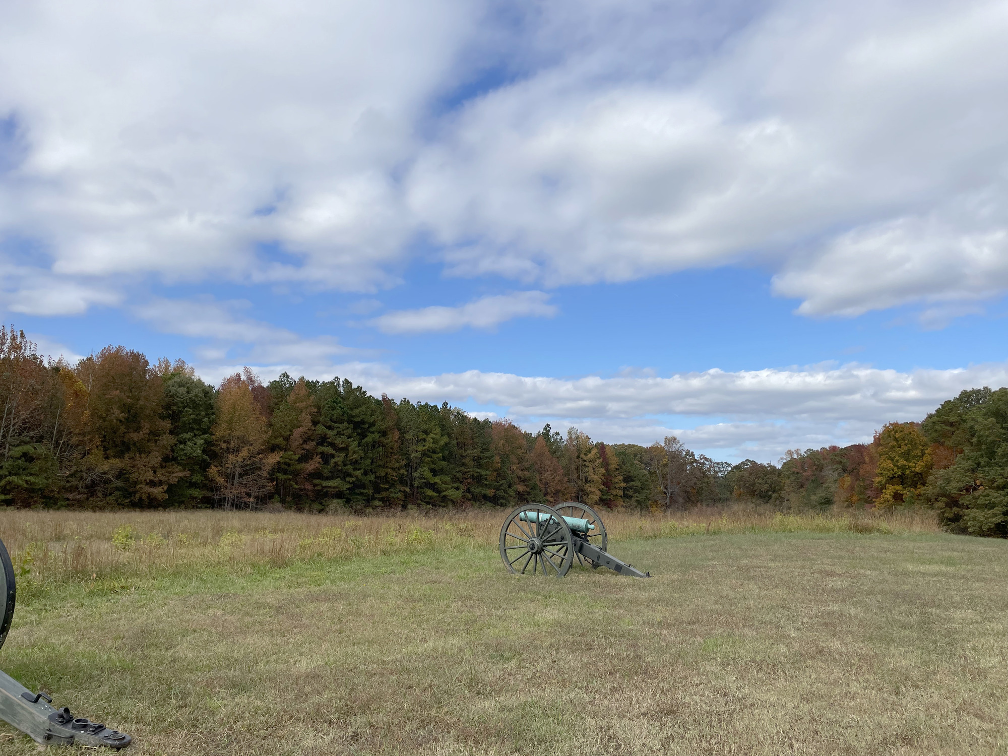 A cannon stands in a field of brownish-green grass with a line of trees with leaves of varying shades of green, red, yellow, and brown on the horizon.