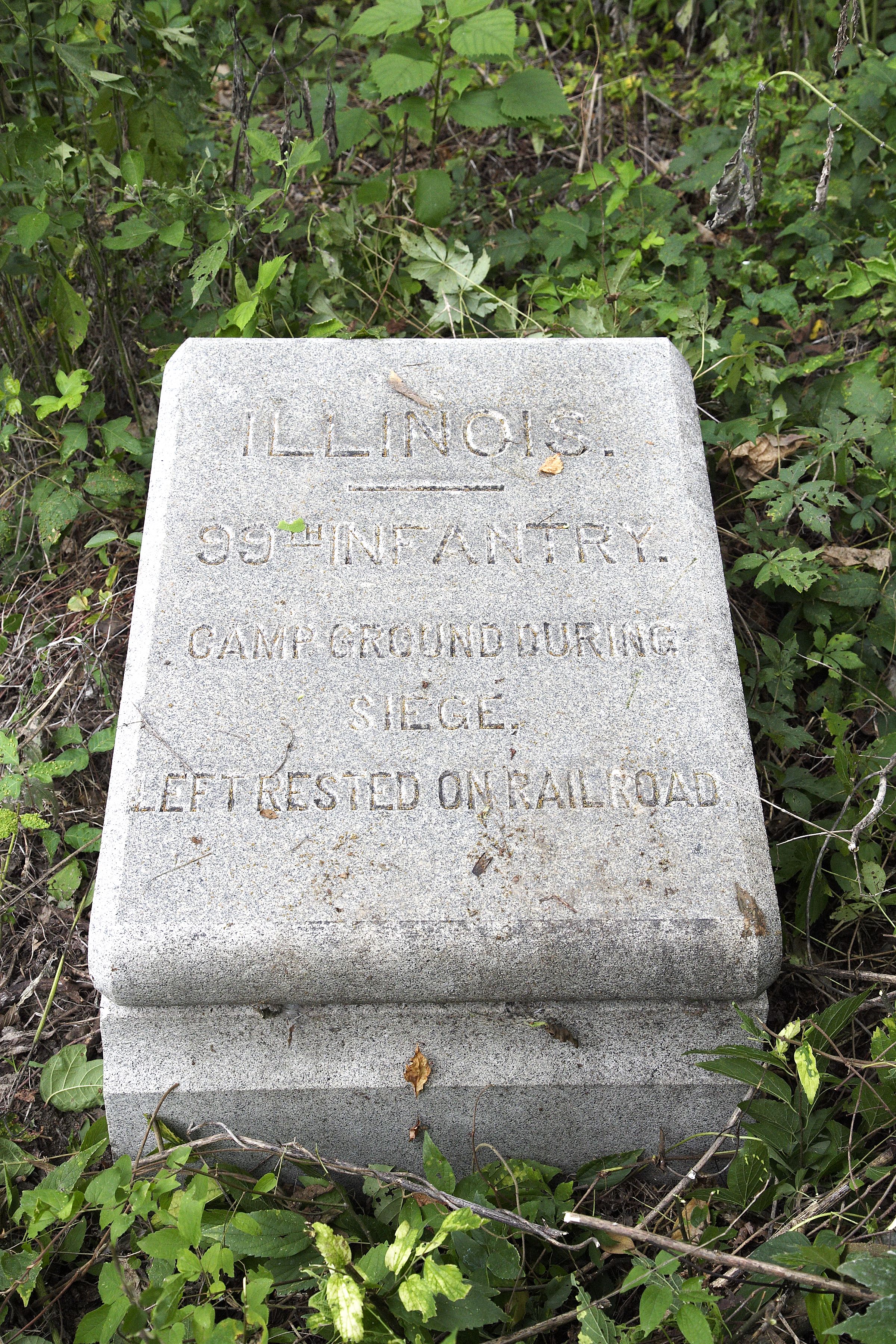 22" x 29" x 16" gray granite marker consisting of a nearly horizontal tablet with beveled edges and inscribed with "ILLINOIS", unit designation, and appropriate information.