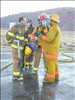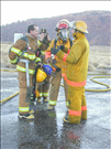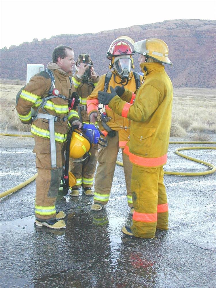 Firefighters fight vehicle fire involving two vehicles in simulation of a broadside collision during training at Mesa Verde National Park in 2001.