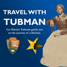 Graphic with white text on a blue gradient background reads "Travel with Tubman: Let Harriet Tubman Guide you on the Journey of a lifetime." Beneath that text is a colored version of the National Park Service Arrowhead and the National Underground Railroad Network to Freedom Logo. To the right is an image of a young Harriet Tubman sitting in a chair. She wears a long dress, her hair is pulled back with a middle part, and she stares into the camera with a stoic expression.