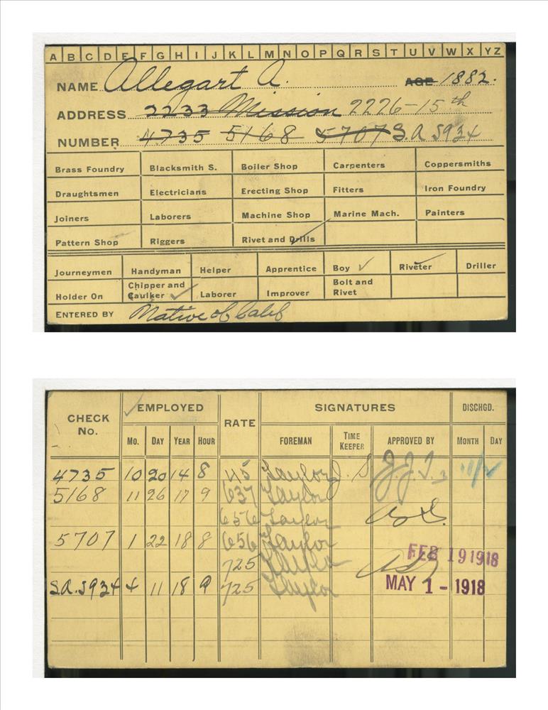 Union Iron Works Co. employee card for A. Allegart