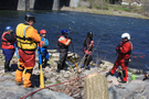 group of people in lifejackets and helmets lean on canoe paddles, listening to another group member in front of the river.