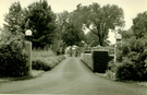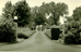 Black and white photo looking up a paved driveway. Stone pillars with globe lights and bushes are on either side of the entrance. One side of the driveway has bushes, the other side of a manicured hedge fence. A rose arbor and part of a house can be seen in the background.