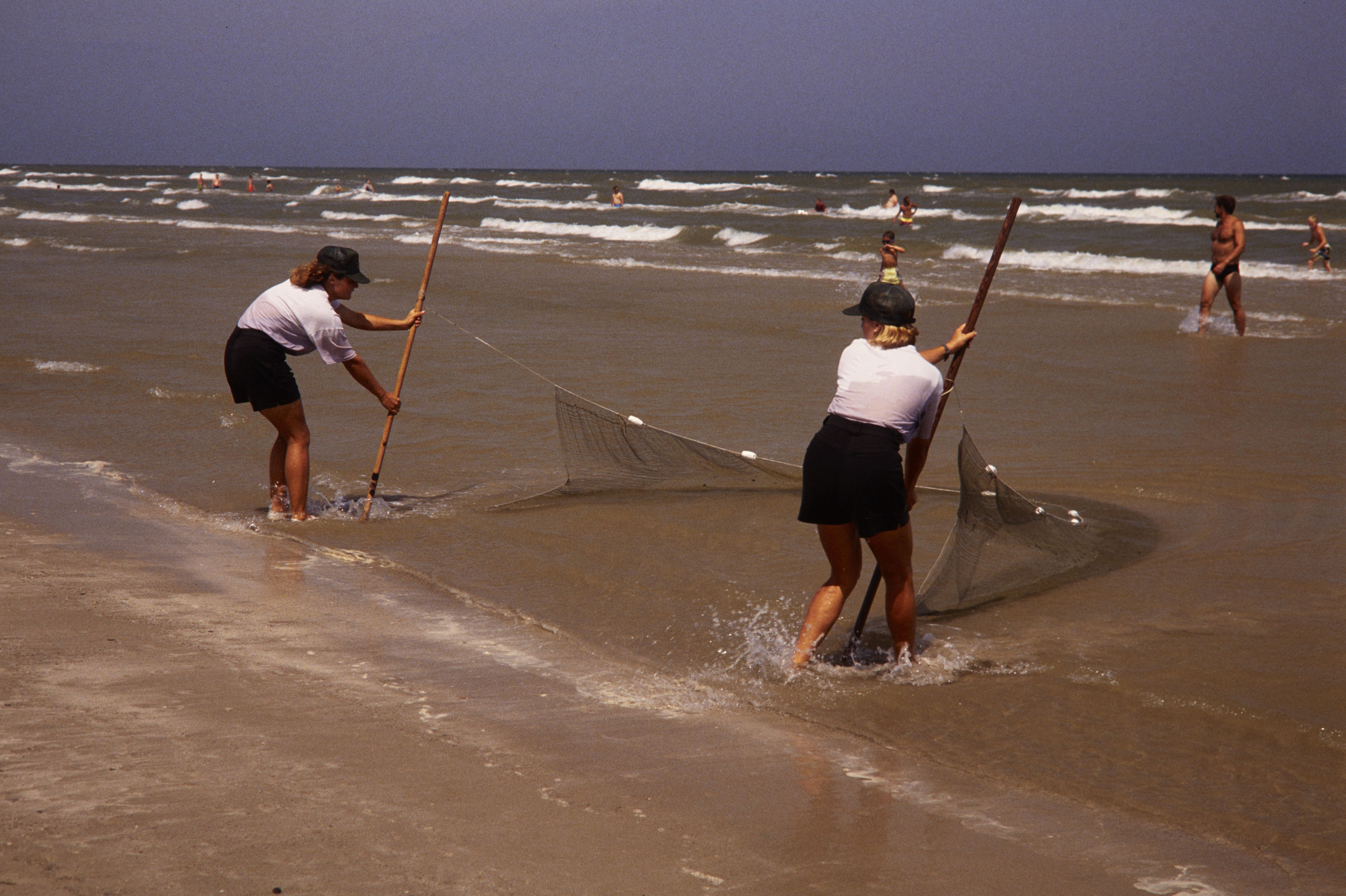 NPS employee pulling in a net on the beach at Padre Island National Seashore.