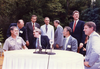 Melvyn Bell and Roger Giddings signing historic property lease. Figures shown are Roger Giddings, Melvyn Bell, Tommy Robinson, David Pryor, Dale Bumpers, and Bill Clinton. HOSP 23929 b and d have handwritten details written on reverse.