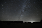 The Milky Way cuts across the sky behind the silhouette of a mesa. Light pollution from a nearby town glows in the lower right corner.