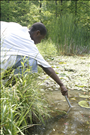 Students are participating in a unit called Roles and Residences. They are exploring the roles of different species and the diversity of habitats in a watershed. Here they are studying a pond ecosystem, catching small animals in nets and observing them in containers. Students record data in their Discovery Books. || The Cuyahoga Valley Environmental Education Center's residential program provides fourth through eighth grade classes an overnight educational experience that integrates science, nature study, environmental issues, and the arts. Students learn natural history and the concepts of watershed, biodiversity, and habitat. In addition, environmental issues and the process of environmental decision-making are explored. The curriculum is designed to meet state standards and teach proficiency skills, especially in science and social studies.
