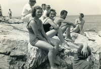 GROUP OF PEOPLE SITTING ON ROCK IN BATHING SUITS.
