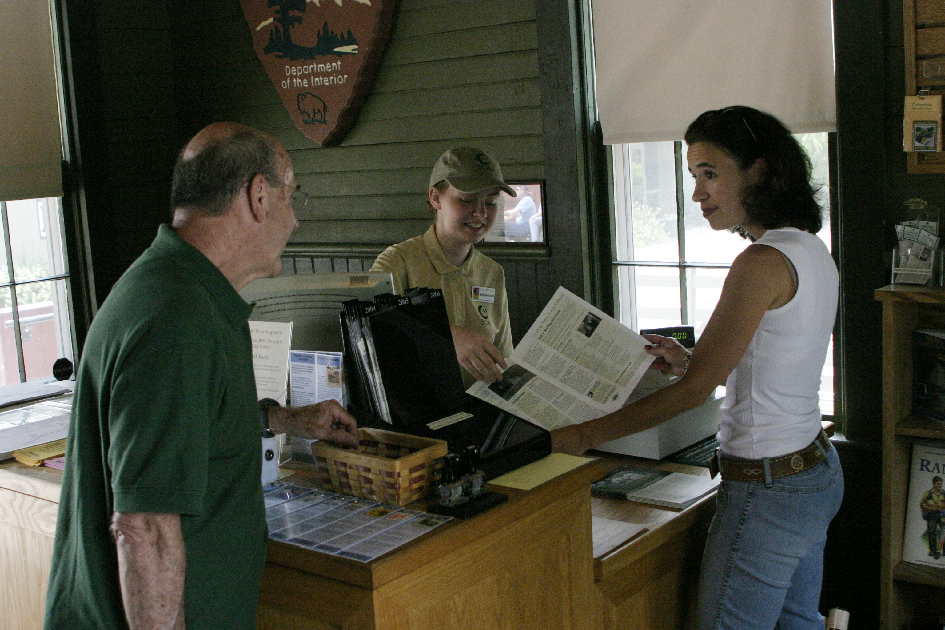 A Student Conservation Association (SCA) intern talks to visitors inside the Peninsula Depot. || Peninsula Depot Visitor Center is an information/orientation facility developed to help visitors explore Cuyahoga Valley National Park, Cuyahoga Valley Scenic Railroad, the historic Village of Peninsula, and the Ohio & Erie Canalway.