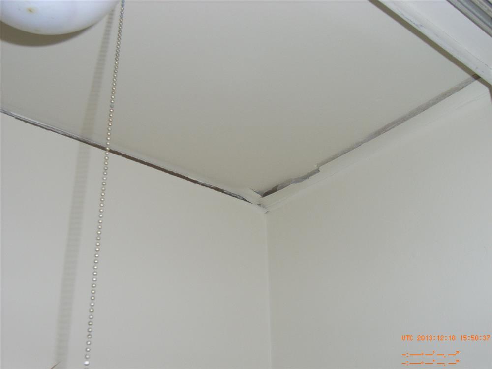 The interior of the building showing where the wall and ceiling seams are coming about. Bathroom needing work.